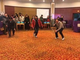 图2: 娱乐竞技活动。滚铁环(左);三人四足(右)