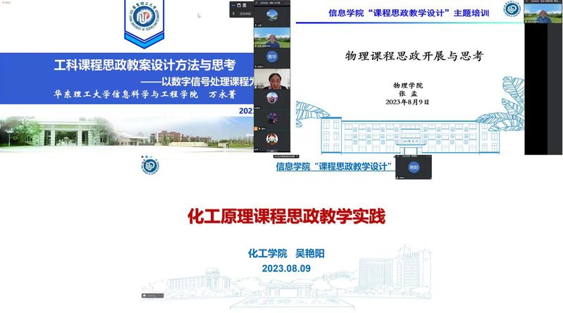 为充分发挥课堂教学主渠道在高校思想政治工作中的作用,构建“三位一体”课程体系,促使各类课程同向而行,形成协同效应,实现全员全过程全方位育人,日本成人视频 于2023年8月9日在线上举行了“课程思政教学设计”专题培训会。本次培训会邀请了教务处副处长万永菁、物理学院副院长张孟、化工学院教学名师吴艳阳就课程思政设计及实施进行经验分享。培训会由信息学院副院长谭帅主持,学院的各系主任、各教研室主任、各专业任课老师参加此次会议。