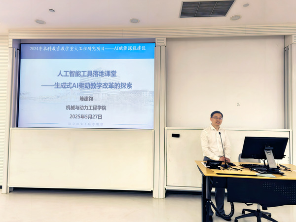 为积极应对教育智能化转型趋势,助力教师探索人工智能与教育教学的深度融合,日本成人视频 于5月27日正式启动“AI赋教,智创未来”专题报告系列讲座。本次活动聚焦AI技术赋能教学创新,通过前沿AI技术创新、多学科案例分享、智能教育工具实践等形式,帮助教师掌握人工智能在教学中的创新应用方法,提升智能教育设计与实施能力,进一步推动教学模式变革与高质量人才培养。首期专题报告会在实验十九楼A201会议室举行,教务处副处长程华、机械与动力工程学院副院长陈建钧应邀作专题报告。日本成人视频 副院长谭帅主持本次活动。