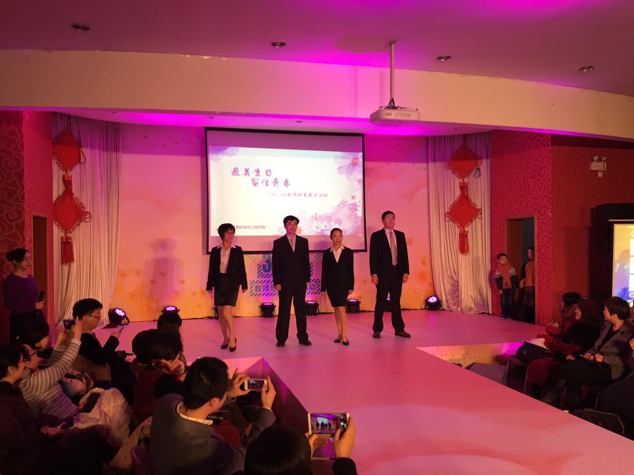 2016年12月16日下午 ,学校工会、人事处在八角亭二楼联合举办“最美生日、留住青春——30、40教师形象展示活动”。信息学院参加人员有:侍洪波、杜文莉、刘志鹏、万永菁、何高奇、梁莹、杨富琴、韩宇光以及30、40教师钟伟民、刘济、徐震浩、王蓓,、张见、蒋翠玲、冷春霞、常虹、朱远明、李进龙、张海腾、叶琪、付歌等20多名教师参加。其中,由院长杜文莉、副书记刘志鹏、副院长万永菁等13名教师组成的展示队代表学院进行了精彩的T台形象展示演出,先后展示了职业装、亲子装、旗袍装、运动装,伴着优美的音乐,信息学院代表队大气、优雅、自信的风采赢得台下一阵阵热烈的掌声,最终在全校11支参演队伍中拔得头筹,荣获“最佳展演奖”。