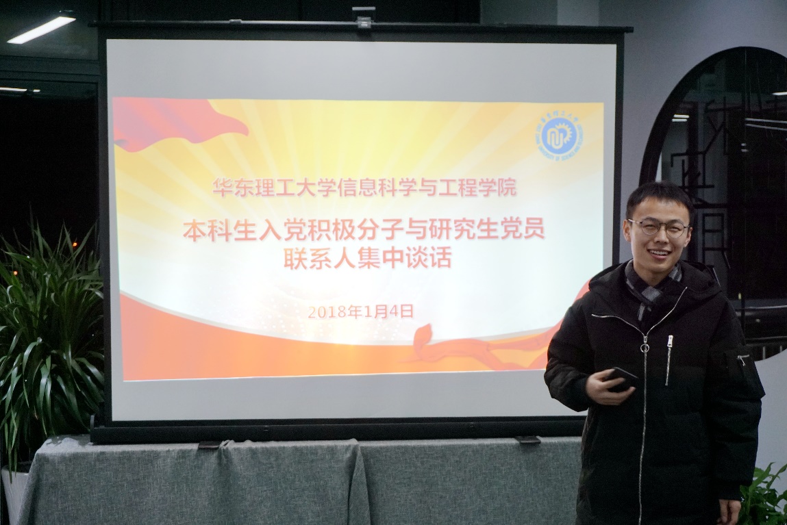 1月4日晚上,信息学院组织完成第26期入党积极分子培训班的新一期本科生入党积极分子与对应的研究生入党联系人进行首次集中谈话活动。活动在奉贤校区实验一楼阳光育人平台举行,近20余名学院17级硕士研究生党员担任此批本科生入党积极分子联系人,本科生党建负责老师张驰参加了谈话活动。
