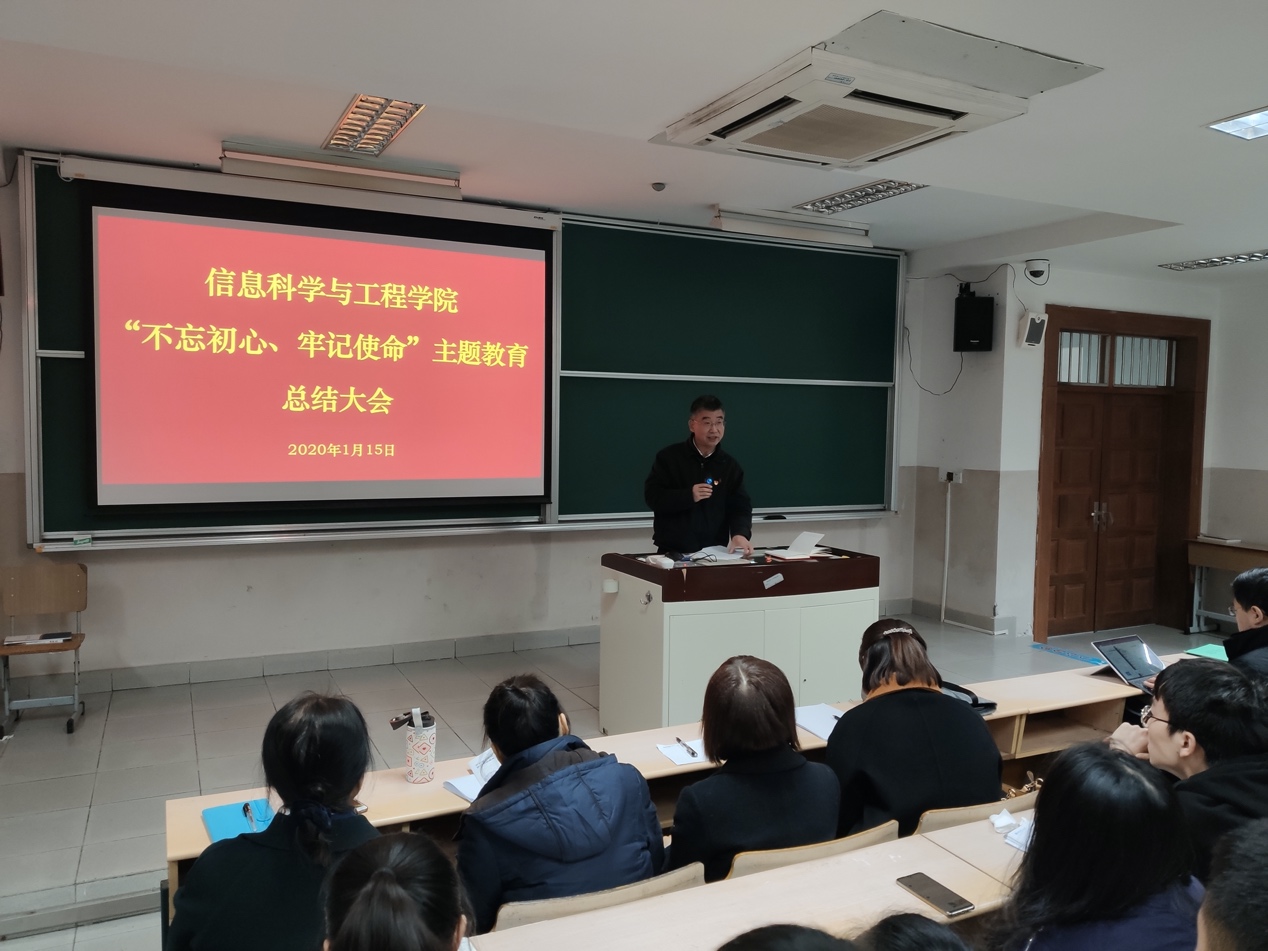 1月15日下午,信息科学与工程学院召开“不忘初心、牢记使命”主题教育总结大会。会议贯彻中央主题教育总结大会精神,总结了信息学院主题教育开展情况,通报了学院专题民主生活会的召开情况。学院党政领导班子成员,党委委员,系所负责人,党支部书记、党员和师生代表共计100余人参加了会议。总结大会由学院党委书记侍洪波主持。